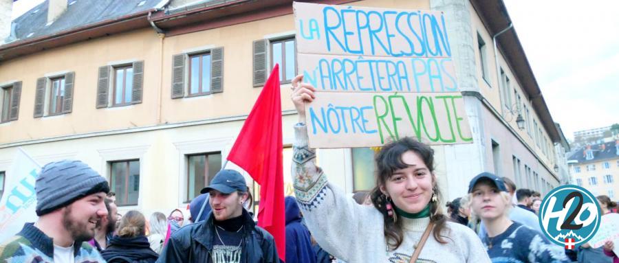 ls étaient 300 à se réunir devant la préfecture de la Savoie à 19 heures. Après une courte série de prises de parole, le groupe a défilé dans les rues de Chambéry en passant notamment par la place des Éléphants. La manifestation rassemble quelques instants plus de 1 000 personnes, selon les syndicats. À la fin de la marche, Chloé reste quelques minutes en tenant fièrement sa pancarte sur laquelle on peut lire "la répression n’arrêtera pas notre révolte”. L’étudiante en troisième année de géographie à Chambéry était à Sainte-Soline lors des affrontements du week-end dernier. Elle nous raconte ce dont elle se souvient en prévenant que “c’est difficile de résumer ce qu’il s’est passé en quelques mots”. “Je pense qu’on a réellement vécu la guerre de l’eau. J’étais en train de dire à mes amis que si les femmes ne sont jamais allées à la guerre en France, c’est peut-être la première fois qu’il y en a qui y sont allées”, confie-t-elle. La jeune femme se souvient de chaque détails de cet affrontement, “ils avaient des bombes et nous des pierres”.