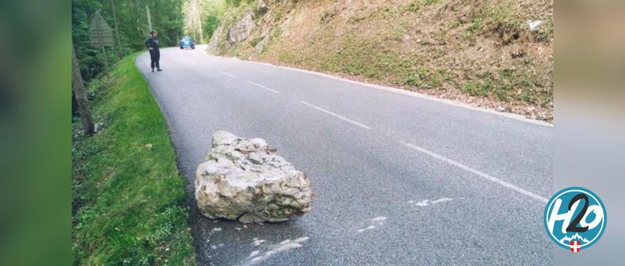 L'axe vient d'être le théâtre d'une chute d'un rocher dont le poids est estimé à +/- 500 kilos environ 2 kilomètres avant le col de la Forclaz, côté Talloires. Par chance, aucun usager n'a été blessé par cette chute.